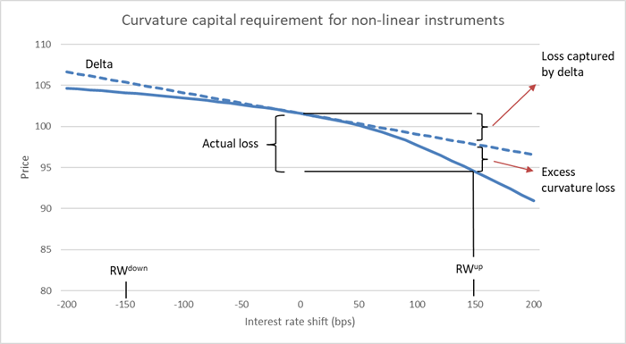 Bonds with optionality may have significant second-order interest rate risk, i.e. curvature risk. Curvature capitalization is calculated by calculating a full repricing shift in instrument value in an upward and downward scenario less the change implied by the delta sensitivities. All curves are shifted simultaneously.