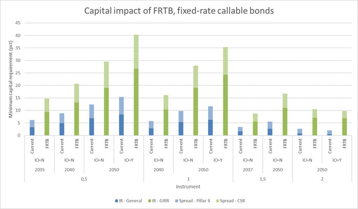 Figure 2 - Capital impact of FRTB on fixed-rate callable bonds. The new capital requirements are compared with the current CRR legislation based on earlier Basel standards. All calculations are performed on 21 October 2019.