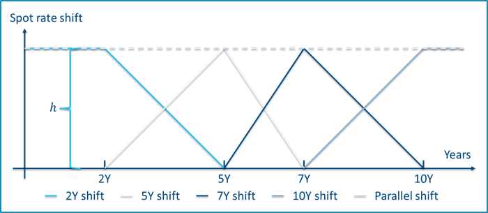 Figure 1 - Triangular spot rate shifts of size h defined by maturity points 2Y, 5Y. 7Y, and 10Y.