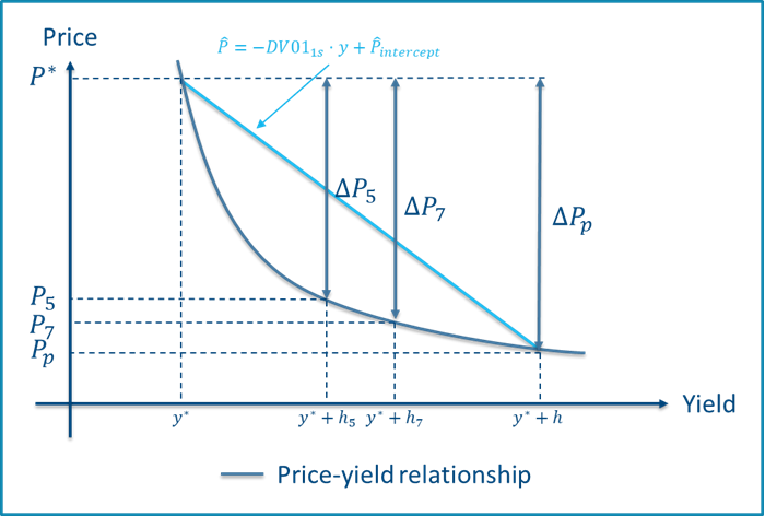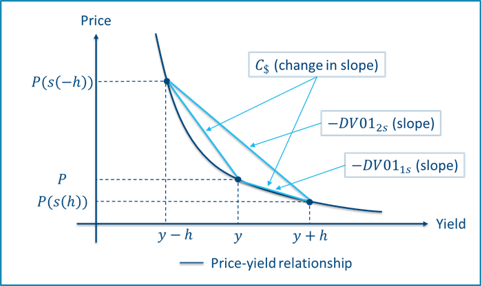 Figure 2 illustrates how duration and convexity measures are found and interpreted based on the price-yield relationship for the typical case of a non-callable bond with positive convexity. The dollar duration approximates the slope of the price-yield curve, whereas the dollar convexity approximates the change in slope, i.e. the curvature.