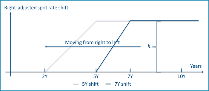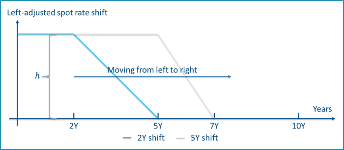Figure 3 shows an example of left- and right-adjusted shifts used to calculate the 5Y key rate figures. The shifts are named after the key rate maturity at which the shift breaks of from a parallel movement to a linear decline.