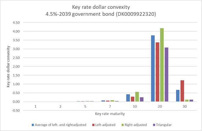 From the example, it is seen that the key rate dollar convexities based on triangular shifts are generally lower compared to left- and right-adjusted figures. This is a natural consequence of the fact that the sum of triangular based key rate dollar convexities is always smaller than the dollar convexity, whereas left- and right-adjusted dollar convexities add up.