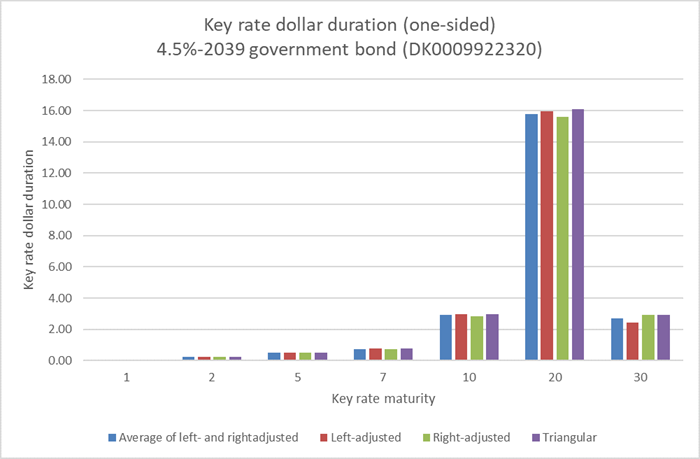 The bullet bond pays a fixed coupon of 4.5% per year and is non-callable with 21 years to maturity, and we therefore expect the durations to be centered around the 20 year key rate which is also the case. Furthermore, we observe that the triangular shifts give rise to the largest key rate durations for all maturities. This is in line with our previous finding that one-sided triangular spot rate shifts result in too much duration.