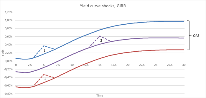 The usual way of calculating interest rate sensitivities for FRNs is to shift both curves simultaneously. However, Basel (Jan 2019) 21.8 (1c) stipulates a different approach. We need to shock both curves exclusively and the interdependency of the curves is captured using the correlation matrix with a curve correlation of 99.9%. Figure 2 shows an example of the shocks performed in the GIRR calculations.