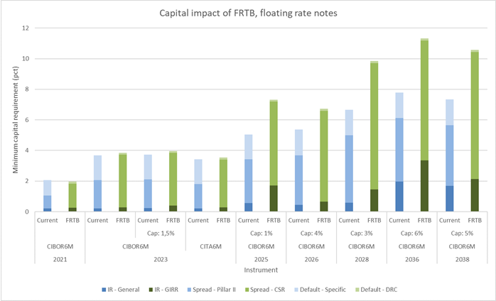 Figure 5: Estimated capital impact of Danish floating rate mortgage bonds for Danish banks. We estimate that the capital requirements stay roughly the same for short-term FRNs. The capital impact on long-term capped floaters lies around 30-40%.