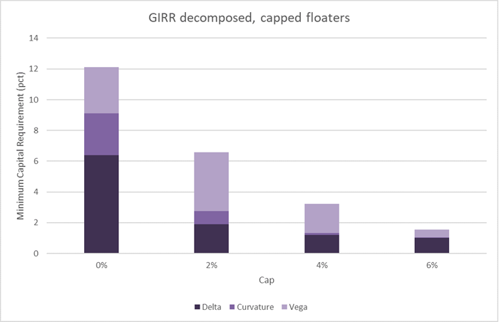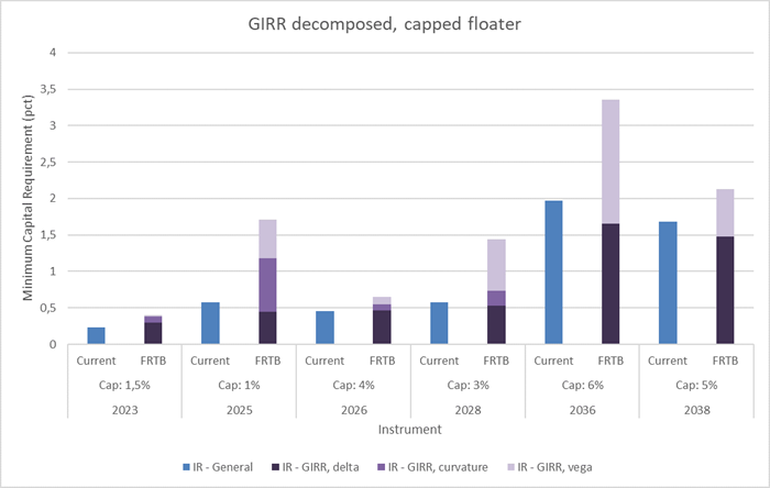 Figure 6: GIRR decomposed into delta, curvature and vega for capped floaters. The numbers are compared to current legislation. Some bonds are facing a tripling in general interest rate risk capitalization because of FRTB’s inclusion of curvature and vega risk.