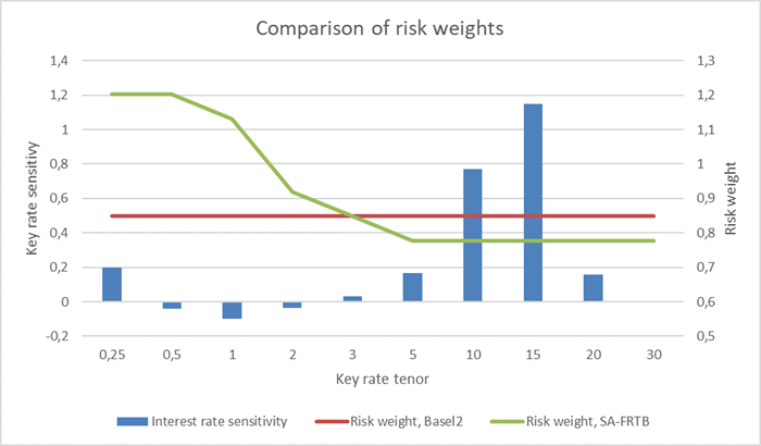 The third thing to notice from Figure 6 is that the current legislation creates higher first order (delta) capital needs than FRTB for the two longest bonds. This is because the risk weights are higher in Basel II and CRR. Here, the risk weights are fixed for all tenor points on the yield curve and are solely determined by the duration (DV01) of the bond. “TK Cibor6M 0%, 6% 2036” and “JYK Cibor6M 0%, 5% 2038” have a DV01 of 2.21 and 1.88 respectively. In CRR they are assigned a risk weight of 0.85%. On the other hand, FRTB and CRR2 recognize that the shortest interest rates fluctuate the most, and the introduction of yield curve tenor risk factors enables longer tenors to be assigned with smaller risk weights. Figure 7 illustrates why general interest rate risk capital requirements are decreasing for the two longest capped floaters.