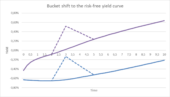 As shown in Table 1, we need to shock two curves in the FRTB calculations of RTL bonds. When the risk-free curve is shifted, the credit spread must be kept fixed. Figure 2 illustrates a bucket shift to the risk-free curve, i.e. the shifts to be applied in the GIRR case.