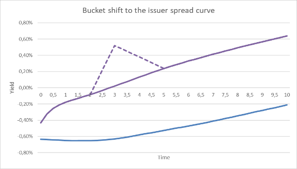 Figure 2: A bucket shift to the 3Y tenor for the risk-free yield curve (blue) also leads to a shift in the issuer credit spread curve (purple). This represents the GIRR case.
