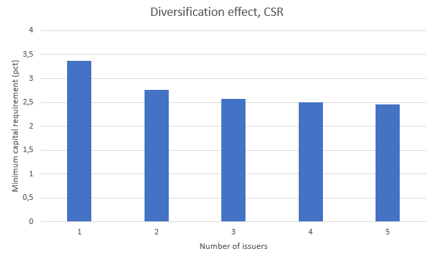 In a portfolio, we start out with only “1 RD T RTL 2023” and add one bond at a time distributing the invested amount in each bond uniformly. The correlation multiplier for bonds of different issuer names should reduce the CSR charge. Figure 6 shows the results. CSR capital needs decreases from 3.36 to 2.45 (approximately 27%) when moving from one to five bond issuers.