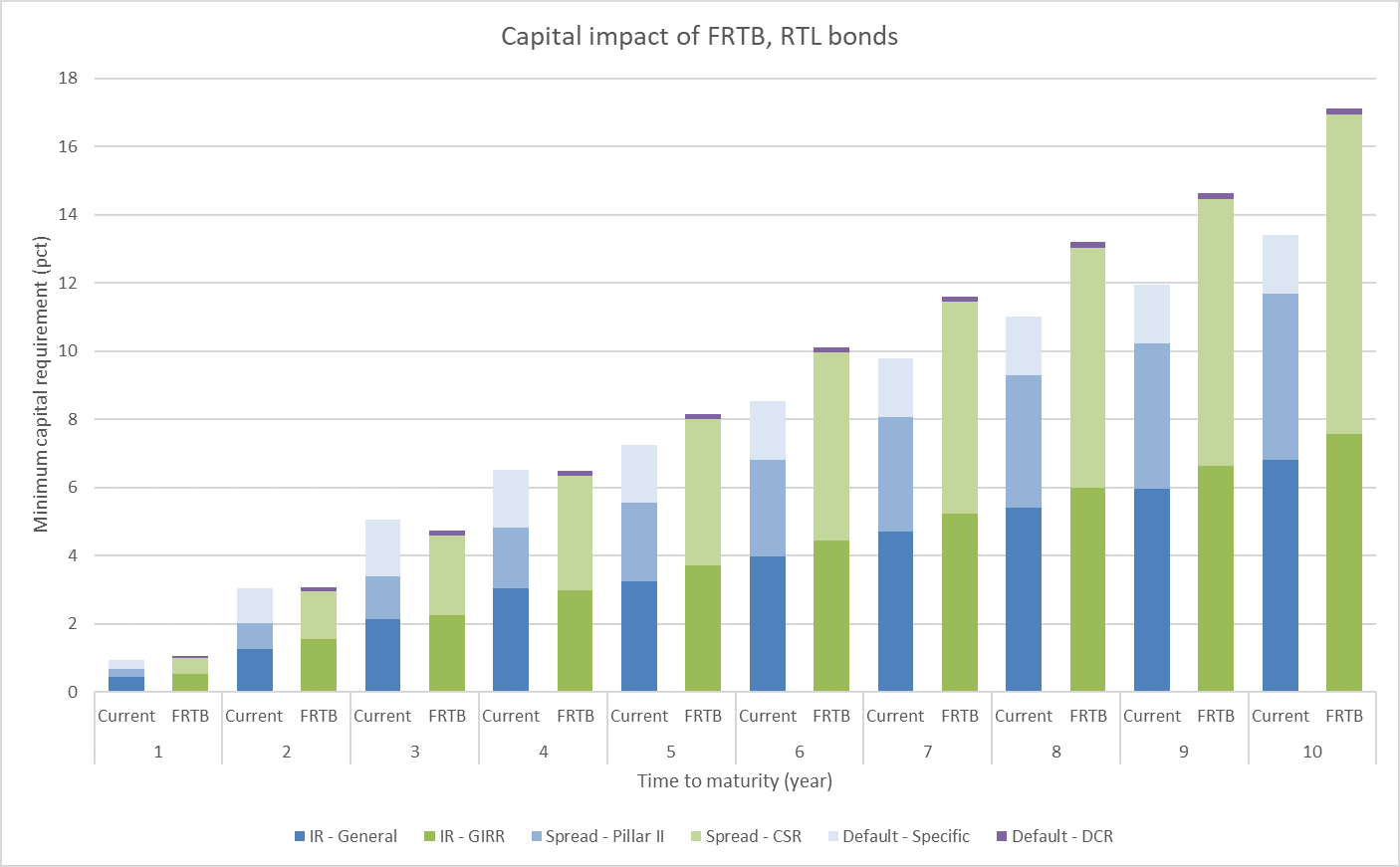 When we compare the new capital charges with existing ones, we observe a smaller capital impact than anticipated, the highest being 27% for the 10-year bonds. However, this could be due to the Danish interpretation of default risk capitalization. If we exclude the default risk component, the capital impact is very close to 40% for all RTL bonds. Either way, these numbers are not likely to cause material changes in Danish banks’ appetite for RTL bonds.