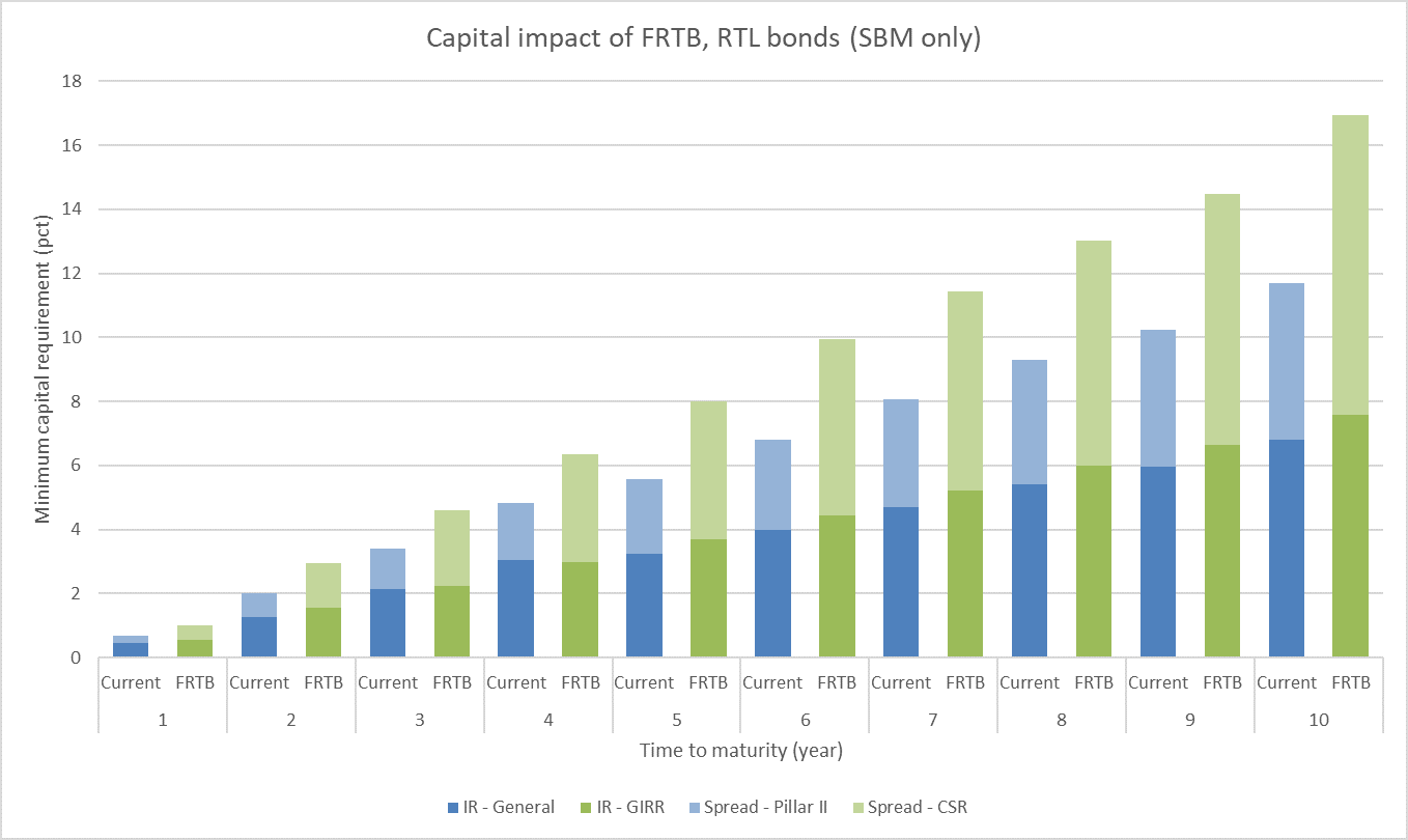 In this blog, we outline how the SA-FRTB guidelines should be implemented on Danish RTL bonds. To keep things simple, we calculate SA-FRTB minimum capital requirements for non-hedged, single bond portfolios. Compared to current Danish legislation we find that the highest increase in required capital is 27% and is imposed on the longest RTL bonds. This is somewhat less than indicated by the Basel Committee and for medium-term bonds, the capital requirements actually decline.