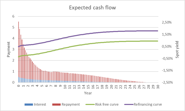 - Selve betalingsrækken afhænger af låntagernes konverteringsadfærd og er derfor stokastisk. Låntageren beslutter, om lånet skal indfries baseret på de til enhver tid gældende refinansieringsrenter.