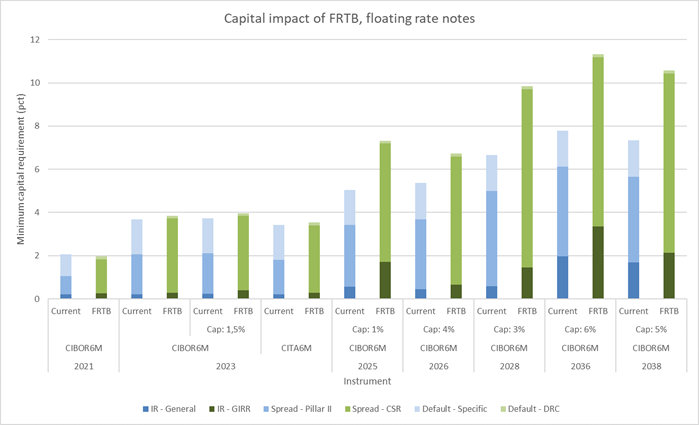 Variabeltforrentede obligationer uden cap er blevet populære til funding af realkreditlån i de senere år, og de udstedes generelt med en løbetid på mindre end fem år. Vores beregninger viser, at kapitalkravene for disse obligationer er nogenlunde uændrede ved overgangen fra den nuværende lovgivning til FRTB.