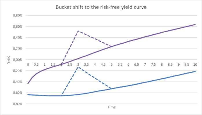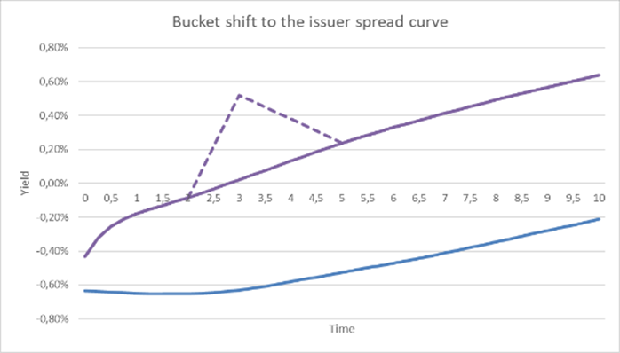 Figur 2: Et triangulært nøglerentestød til 3Y punktet for den risikofrie rentekurve (blå) slår også ud i kreditspændkurven (lilla), da kreditspændet holdes fast. Dette repræsenterer GIRR metoden.