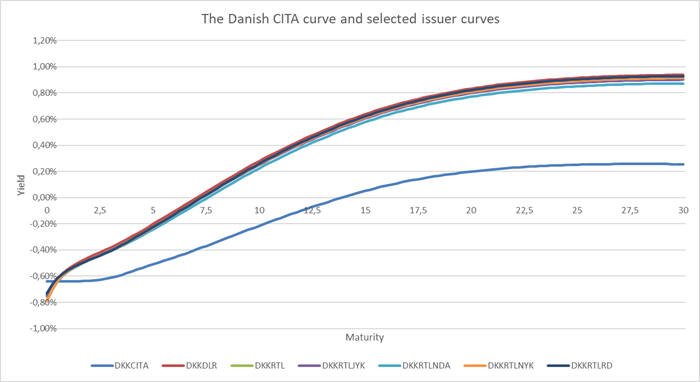 Vi bruger CITA-kurven som den risikofrie rentekurve, og i alle vores beregninger benytter vi den pågældende udsteders kreditspændkurve som kreditkurve. Det vil sige, at spændkurverne er estimeret ovenpå CITA-kurven med et sample bestående udelukkende af RTL-obligationer.