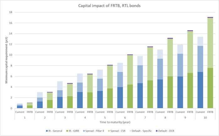 I denne blog beskriver vi, hvordan SA-FRTB skal implementeres for danske RTL-obligationer2 . For at simplificere analysen regner vi på porteføljer med én ikke-afdækket position. Sammenlignet med de nuværende danske regler estimerer vi, at den højeste stigning i kapitalkravet bliver 27% og vil ske for de længste RTL-obligationer. Det er noget mindre end indikeret af Basel-komitéen, og for visse mellemlange obligationer vil kapitalkravet faktisk falde.